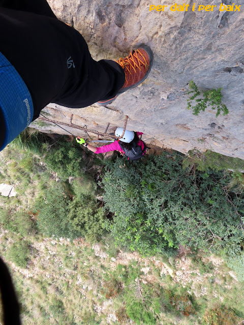 Recuerdo la Nochevieja de 2022 con especial cariño, por eso de saltarse lo socialmente establecido y tal... Cené en casa y solo; nada especial en el menú, bueno si, me bebí una copa de vino; la tele la encendí para verme de nuevo la peli Everest; y antes de las doce ya estaba durmiendo... Así que, sin cena opulenta, uvas, ni casposa programación televisiva, por digerir; con cero resaca y con cero pereza, bastante antes de mediodía ya estábamos pertrechados con los trastos ferrateros y en plena aproximación a la ferrata, ferrata que por cierto empieza en descenso. Hay que bajar a un barranquete, donde hay instalado un puente monocable, que digamos que necesitaba algo de tensión, y que puso el primer toque picante de la mañana. Se pude bajar a él mediante un corto rápel, o por grapas, a gusto del consumidor... Cruzado el puente se sale del barranco combinando grapas y agarres naturales, un tramo entretenido... Pero lo bueno de la ferrata llegaba a la par que llegaba la verticalidad. El paso de salida, unos alejes, y una travesía horizontal con clavijas iban a dictaminar si todavía estaba apto para hacer ferratas o por el contrario debería retirarme para siempre de esta modalidad. Apretando el culete un poco más de la cuenta, pero con dignidad, creo, salvé la criba. Isa lo pasó sobrada. Superado el paso horizontal la pared tumba un poco y disminuye la dificultad, aún así esta sección, aunque corta, es muy explosiva, y solo por ella ya merece la pena venir a hacer esta ferrata. La última sección equipada de la ferrata fue un mero y sencillo trámite. No fue tan fácil, en un día tan ¿especial? como ese, encontrar un bar abierto en Tavernes de la Valldigna, al final encontramos uno, en el que nos comimos unos bocatas que nos cobraron a precio de aceite de oliva, del virgen extra...